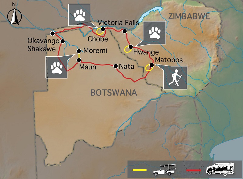 - Beleef wild in beroemde wildparke, het water van de Okavango Delta en als afsluiting de Victoria Falls.